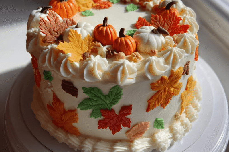 Step 16: Decorate your cake with edible decorations like autumn leaves and pumpkins.